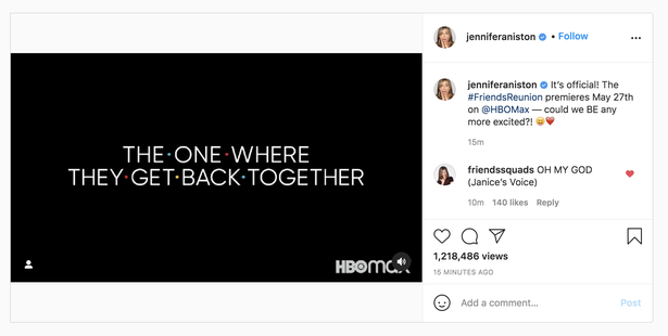أعلنت الممثلة الأميركية جنيفر أنستون عبر صفحتها الرسمية على الإنستغرام لمتابعيها البالغ عددهم أكثر من 36 مليون شخص عن موعد اذاعة حلقات لم الشمل المسلسل الشهير Friends وارفقت بالمنشور مقطع ترويجي صغير لحلقات المسلسل الجديدة التي ينتظرها الملايين حول العالم.