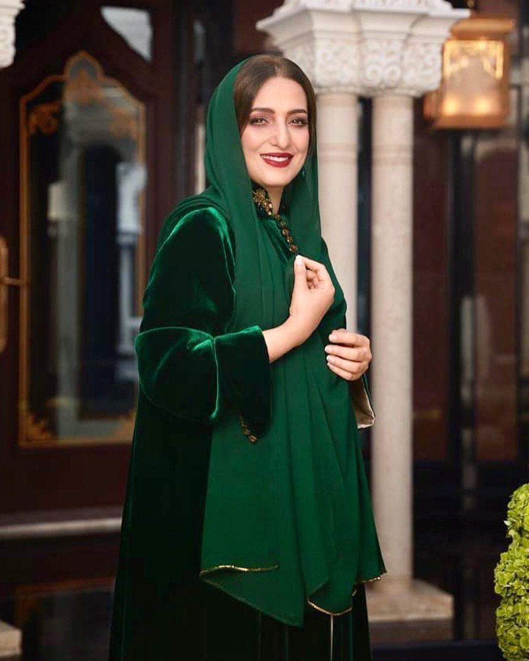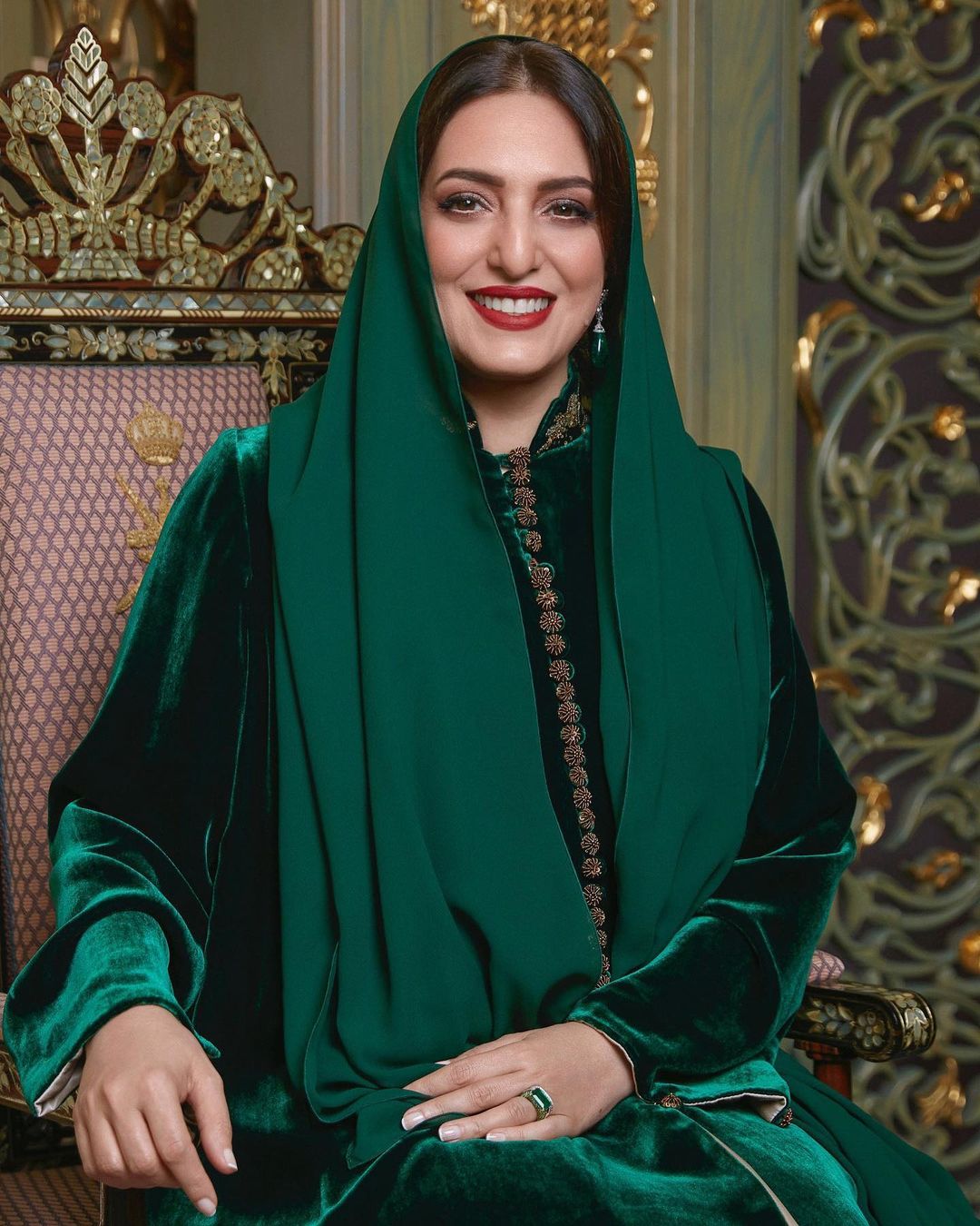 وأطلت السيدة عهد بإطلالة خلابة بثوب من المخمل باللون الأخضر الملكي نالت استحسان كل من شاهد الصورة ولفتت النظر إلى الأناقة الخاصة بها.
