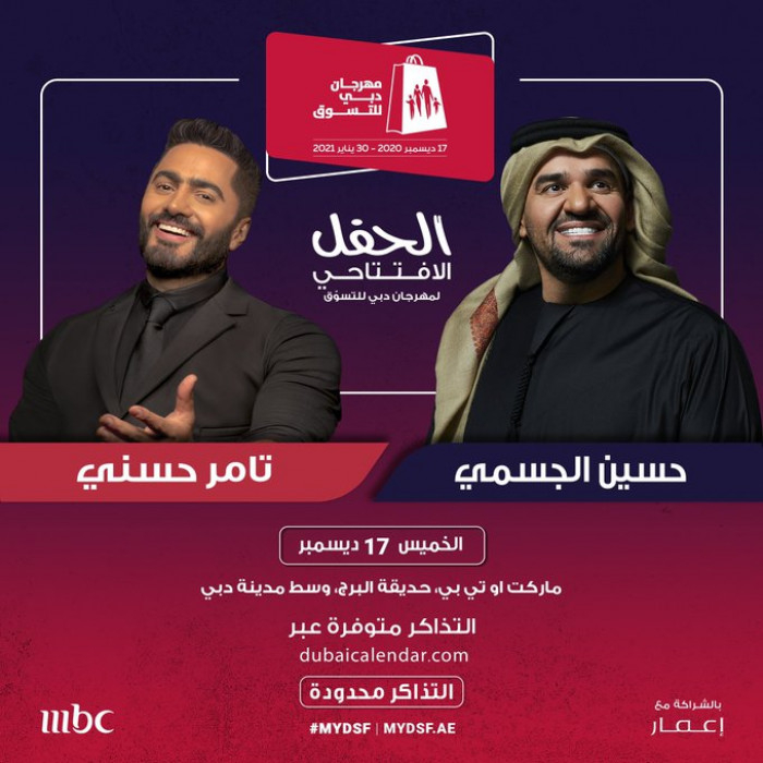 يحيي النجمان حسين الجسمي وتامر حسني حفلاً موسيقياً في الليلة الأولى من عطلة نهاية الأسبوع الافتتاحية لمهرجان دبي للتسوق، حيث سيقدم النجمان اللذان يتمتعان بشهرة كبيرة في العالم العربي مجموعة من أجمل أغانيهما في حفل مباشر يوم 17 ديسمبر بمناسبة انطلاق دورة العام الحالي من مهرجان دبي للتسوق.