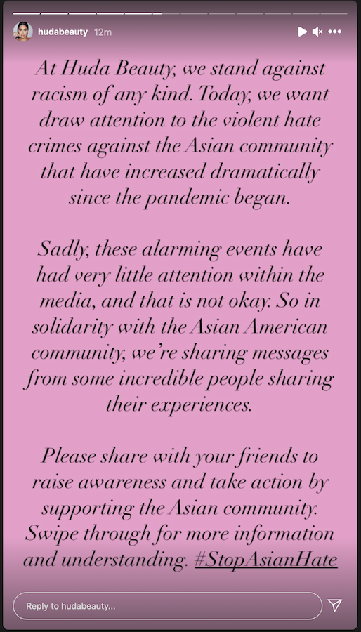 ونشرت هدى عبر صفحتها الرسمية الخاصة بعلامتها التجارية للمكياج Huda Beauty على تطبيق "إنستغرام" بيانًا قالت فيه: "في Huda Beauty، نقف ضد العنصرية من أي نوع. اليوم، نريد أن نلفت الانتباه إلى جرائم الكراهية العنيفة ضد المجتمع الآسيوي والتي زادت بشكل كبير منذ أن بدأ الوباء".