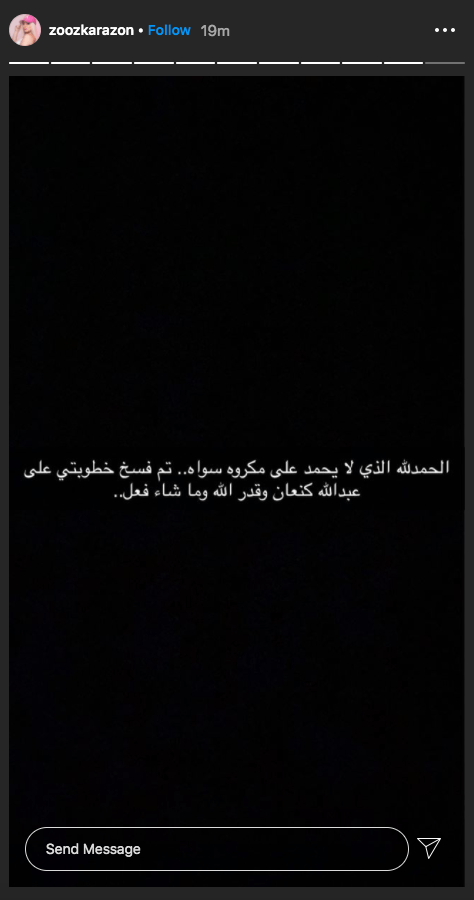 وكتبت زين عبر بوست قائلة : " الحمد الله الذي لا يحمد على مكروه سواه.. تم فسخ خطوبتي على عبدالله كنعان.. وقدر الله وما شاء فعل".