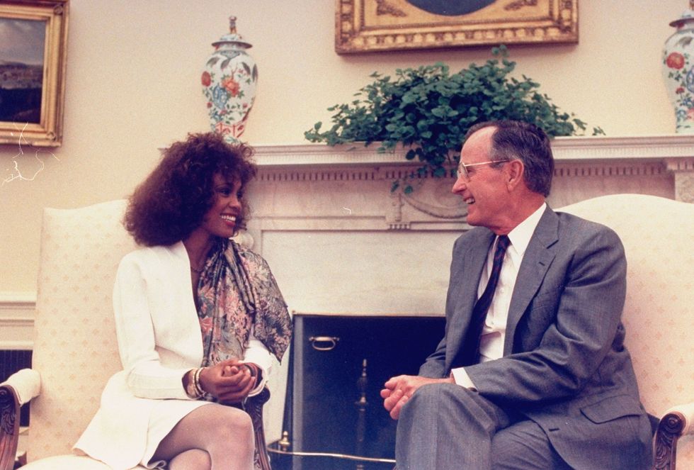 قابلت المغنية الامريكية ويتني هيوستن الرئيس الأمريكي جورج إتش دابليو بوش الاب في عام 1990 وارتدت بدلة من قطعتين باللون الأبيض ووضعت وشاحًا ملونًا على كتفها وارتدت زوج من الجوارب البيضاء الشفافة.