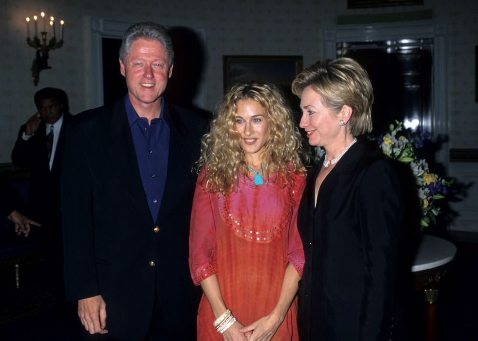 تقابلت الممثلة الامريكية سارة جيسيكا باركر في بداية مشوارها الفني مع الرئيس الأمريكي في ذلك الوقت وهو بيل كلينتون وقد فضلت إرتداء فستان محتشم باللونين الاحمر والفوشيا واسدلت خصلات شعرها الشقراء على جانبي وجهها.