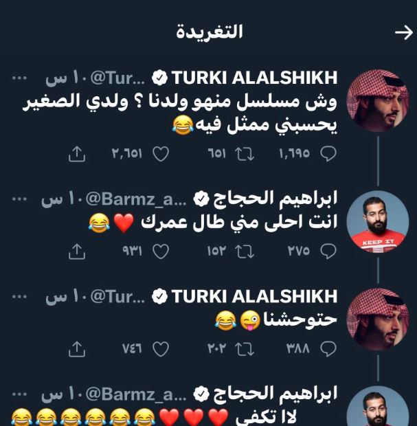 ليرد عليه المستشار تركي ال شيخ ممازحًا" :حتوحشننا"، كما اضاف ابراهيم الحجاج موضحًا في تغريدة اخرى: "أتشرف بالتشبيه طال عمرك، هذا مسلسلنا على شاهد وعلى ام بي سي الساعة 7 ونص بعد المغرب"