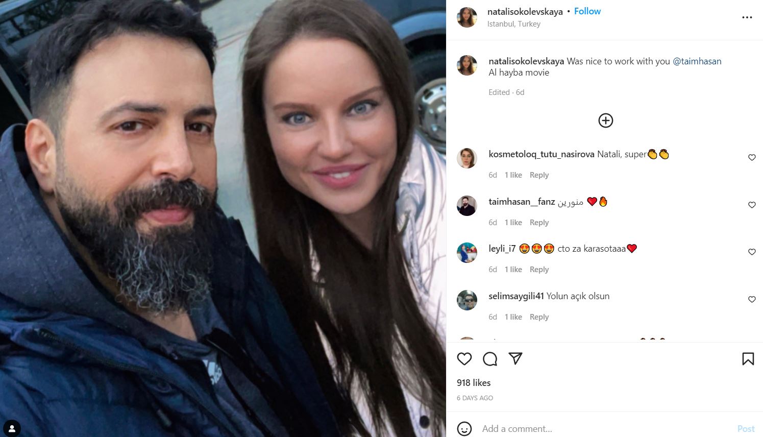 وبالرغم من اشارة نتالي للفنان السوري في الصورة الا انه لم يعيد نشرها مشاركتها مع الجمهور، فيما أكد الجمهور أنه ملكة جمال اذربيجان نتالي سوكوليفسكايا ستكون مفاجاة فيلم الهيبة الذي يجري تصويره حاليًا في تركيا