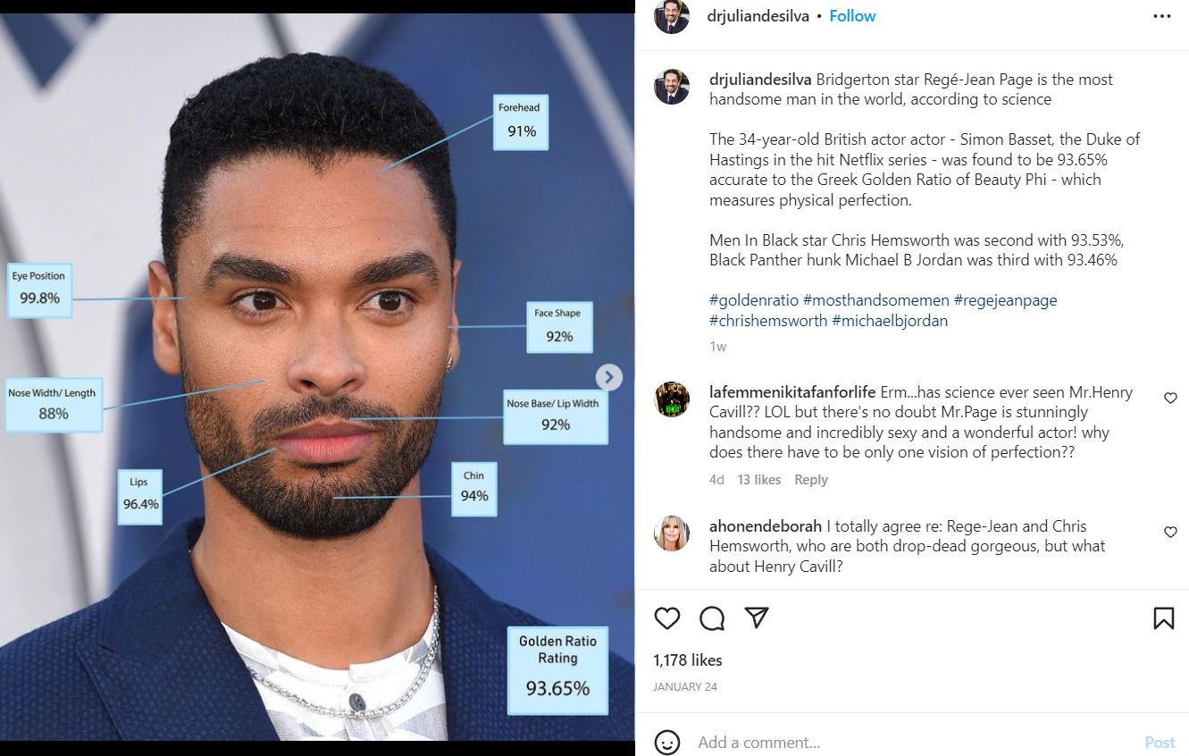 وقال جوليان بأن بطل مسلسل Bridgerton يتمتّع بأكثر الوجوه تناسق وجاذبية، ومن خلال تقنيات رسم خرائط الكومبيوتر للوجه فقد حصل ريج جان على المواصفات الجمالية بنسبة 93.65% وبذلك يتصدّر قائمة المشاهير الأكثر وسامة.