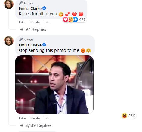 وتفاعل الجمهور بشكل واسع وسط تعليقات ساخرة مع منشور الفنانة العالمية وجاء في التعليقات: " ايمليا كلارك تشتكي من العرب والمصريين بصفحتها تقول وقفو إرسال الصوره هذي بصفحتي هههههههههههههههههههههه المصريين عقدو ايمليا كلارك كرهوها في حياتها وفي اليوم الي شافت فيه الصوره في رمضااااااان في رمضااااااااااااان"