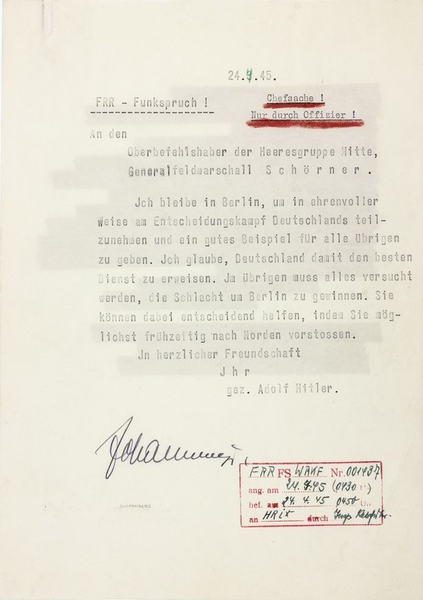 وكتب هلتلر لشورنر رسالة قال فيها: "سأبقى في برلين، لكي أشارك بطريقة مشرفة في المعركة الحاسمة من أجل ألمانيا و لأكون قدوة للباقين، أعتقد أنه بهذه الطريقة سأقدم لألمانيا أفضل خدمة، بالنسبة للبقية، يجب بذل كل جهد ممكن لكسب المعركة من أجل برلين".