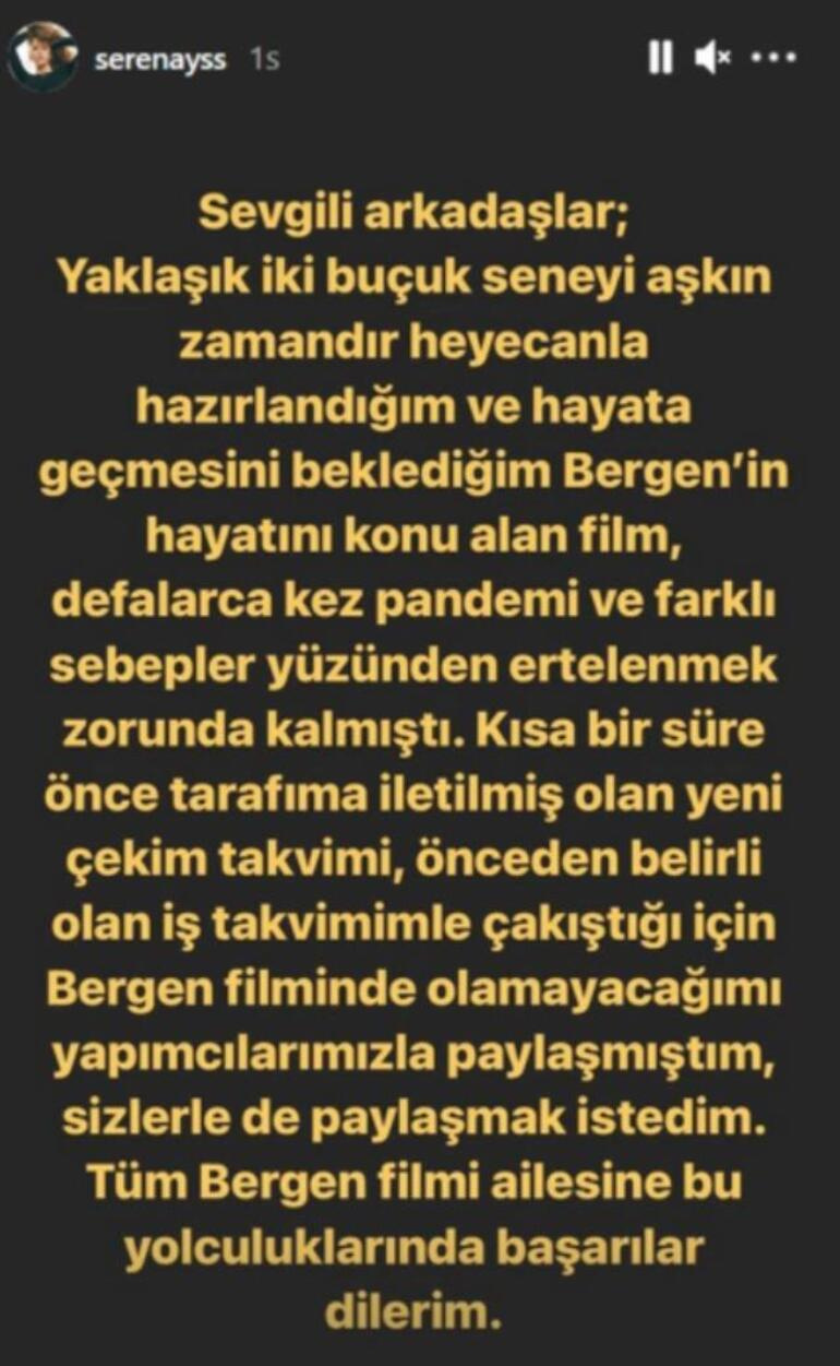 كتبت: " أصدقائي الأعزاء، إن الفيلم الذي يدور حول حياة بيرجن، والذي كنت أحضره له بحماس منذ أكثر من عامين ونصف وأنتظر أن يبصر النور، كان لا بد من تأجيله عدة مرات بسبب الوباء وأسباب مختلفة.