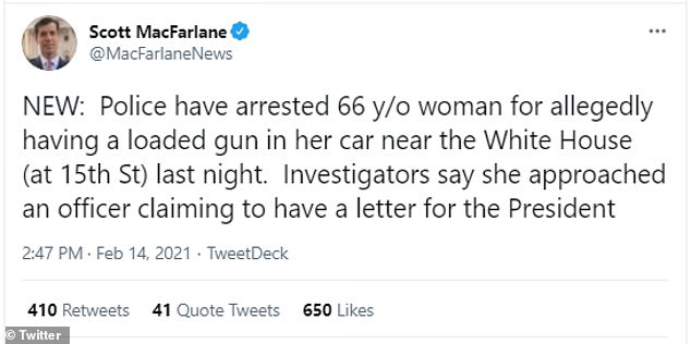 ألقى عملاء الخدمة السرية القبض على امرأة تبلغ من العمر 66 عاماً بالقرب من البيت الأبيض يوم السبت بعد أن ادعت إنها تريد تسليم رسالة مكتوبة بخط اليد للرئيس الأمريكي جو بايدن وأكتشف العملاء بعدها وجود مسدس يد مملوء بالرصاص.