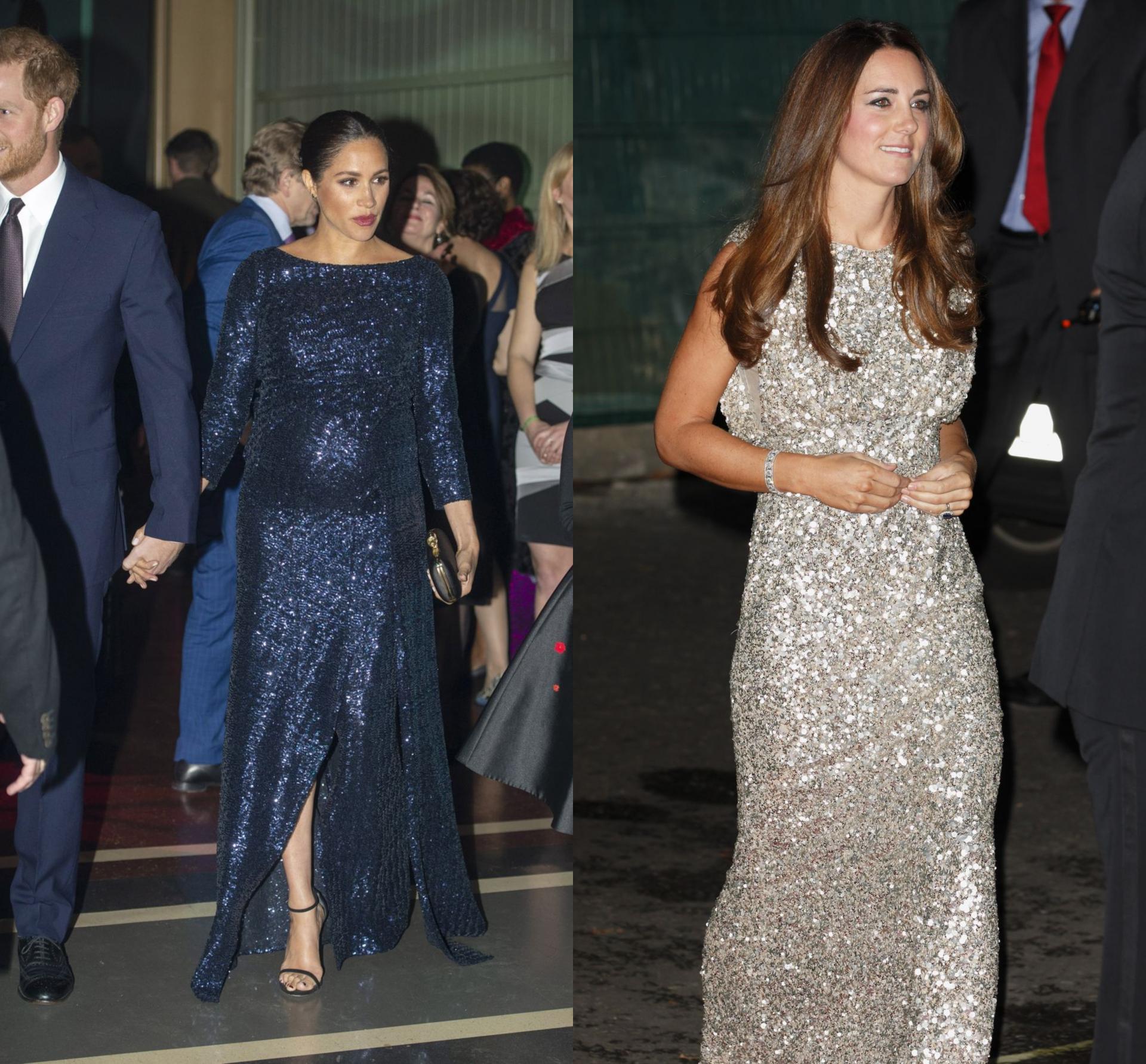 طبقت كيت وميغان موضة الفستان المصنوع من الترتر اللامع واختارت كيت اللون الفضي لإطلالتها أما ميغان فقد حرصت على اختيار لون داكن لنفس استايل الفستان حيث كانت حاملًا في هذه الفترة.