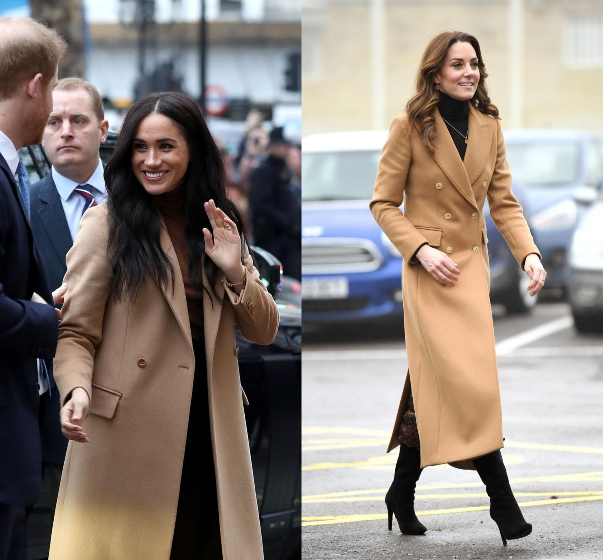 ظهرت ميغان ماركل وكيت ميدلتون بالمعطف الجملي مع إطلالة سوداء كاملة وقاموا بإسدال شعورهم على الكتفين.