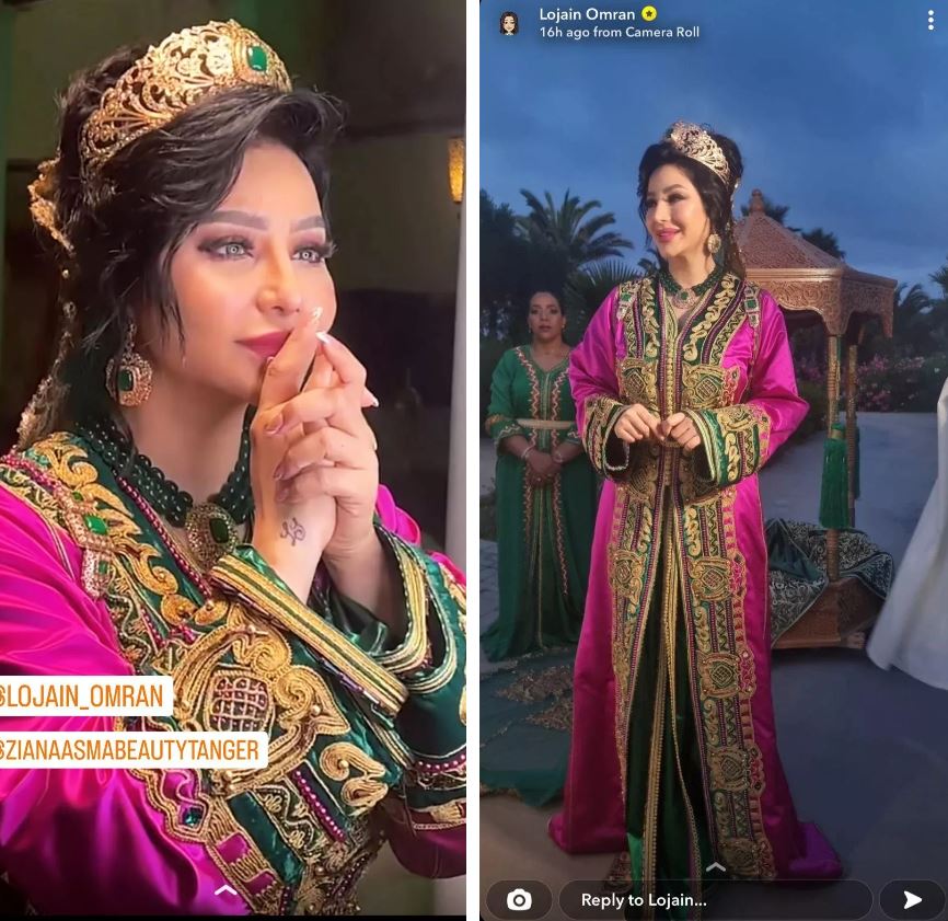 كما تألقت عمران في المغرب بإطلالة ثانية وارتدت قفطان باللونين الوردي والأخضر مع تطريزات باللون الذهبي، وحرصت على وضع تاج ذهبي اللون مع تسريحة شعر مميزة ومكياج لافت