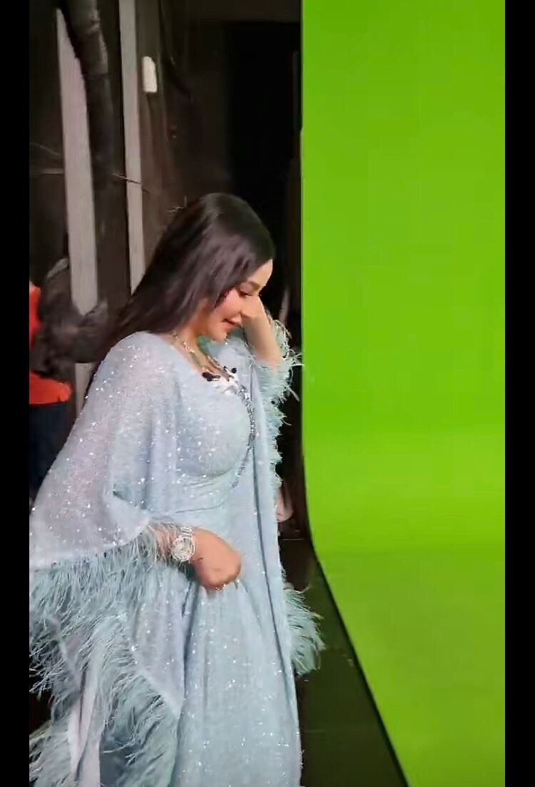 وتألقت الإعلامية السعودية في البرنامج مرتدية فستان باللون الأزرق السماوي مع تطريزات لامعة باللون الفضي، واكمام طويلة مزركشة بالريش واكملت اطلالتها مع قلادة ضخمة وتركت شعرها منسدلًا