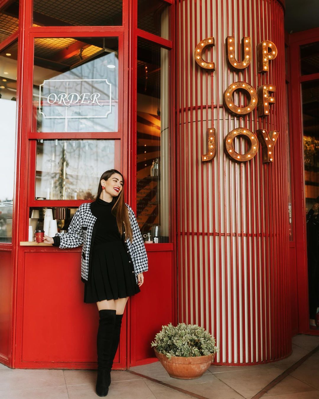تكثر النساء ارتداء اللون الأسود ليبدين أكثر رشاقة، لكن بإمكانك أن تبدي رائعة الجمال وجذابة بهذا اللون بالتحديد إذا استطعت تحويله إلى نقطة إيجابية لإبراز جسدك. وهنا اختارت "روان" فستان قصير أسود فضفاضنسَّقته ببليز كاروهات باللونين الأسود والأبيض، ونسَّقته بحذاء مخملي أسود ذي ياقة عالية.