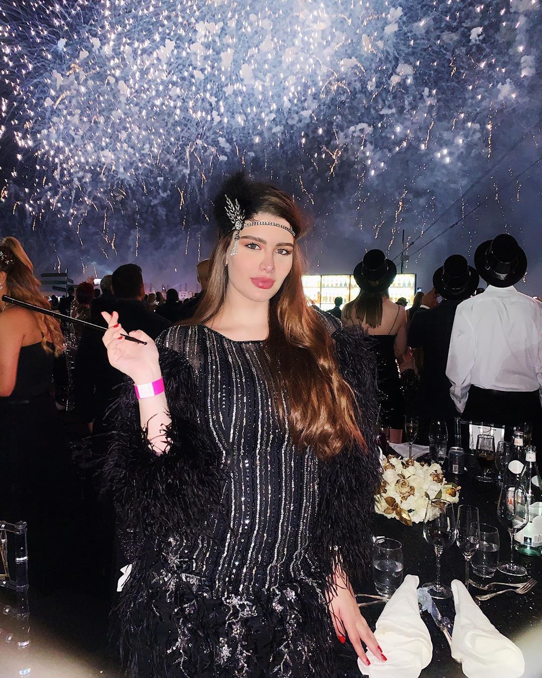 اختارت "روان" للاحتفال برأس السنة فستان أسود ضيِّق مُزيَّن بخطوط طولية فضيَّة براقةً، وأضاف الريش حول حاشية فستانها والأكمام لمسة عصرية واستعراضية.