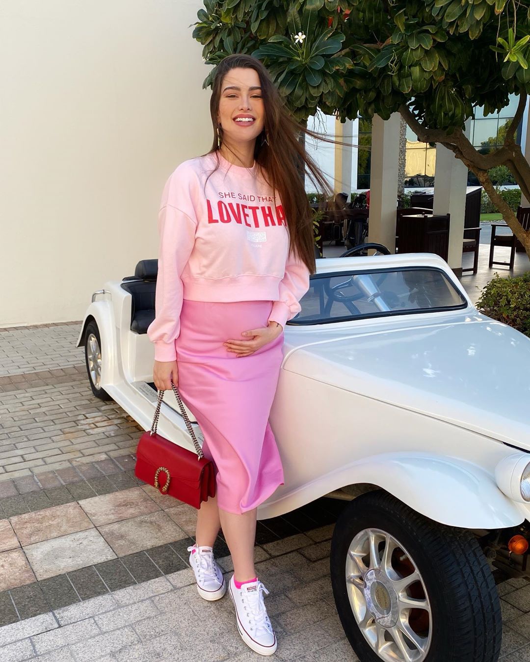 أبرزت الحسناء جانبها الأنثوي بإطلالة ورديَّة مؤلفة من كنزة وردي قصيرة نسَّقتها بتنورة ضيقة مُبرزةً تكوُّر بطنها، في حين انتعلت حذاء رياضي أبيض، وحملت حقيبة يد حمراء.