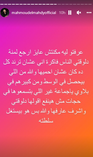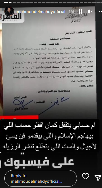 وأضاف محمود المهدي: "ام حسابي يتقفل كمان اقفلو حساب اللي بيهاجم الإسلام واللي بيقدمو فن سيء لأجيال والست اللي بتطلع تنشر الرزيله على فيسبوك." كما وصف عبر فيديو على "ستوري" نقيب المهن التمثيلية أشرف زكي بـ "زوج الست" وأن السبب الذي دفعه لإغلاق حساباته هو هجومه على زوجة الأخير.