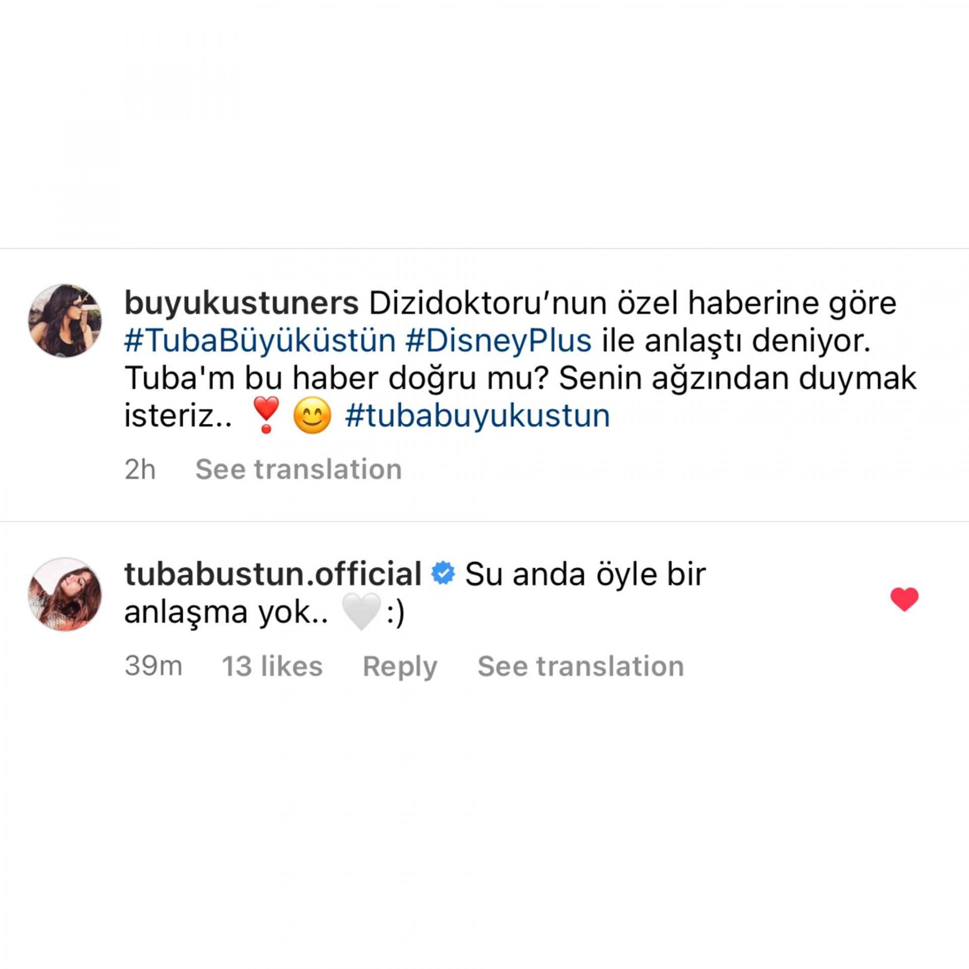 وفي نفس السياق، كذبت الفنانة التركية توبا بويوكستون خبر انضمامها إلى منصة ديزني بلس، وردت على أخبار التي نشرتها الصحفية اويا دوغان عبر مواقع التواصل الاجتماعي وقالت: "حاليًا لا يوجد اتفاق كهذا".