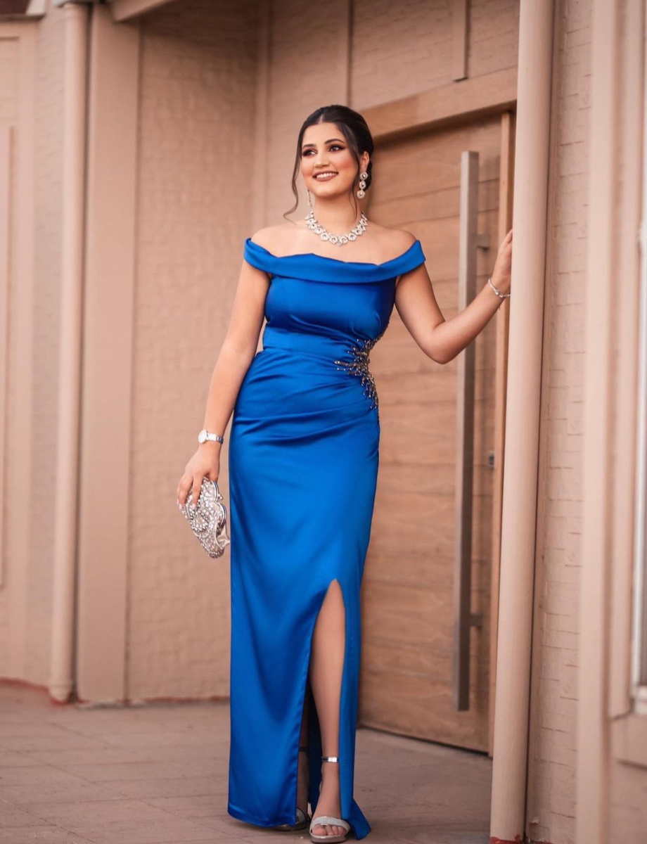 ظهرت الفنانة الشابة في الصور من أحد المناسبات الخاصة بكامل اناقتها، مرتدية فستان ضيق من الستان باللون الأزرق النيلي، وجاء الفستام بدون أكتاف.