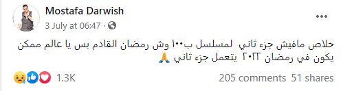 ولكن مصطفى درويش صدم متابعيه، بمنشور عبر حسابه الشخصي على موقع التواصل الاجتماعي "فيس بوك"، حيث كتب: " خلاص مفيش جزء ثاني لمسلسل بـ ١٠٠ وش رمضان القادم". وتابع الفنان المصري: "بس يا عالم ممكن يكون في رمضان ٢٠٢٢ يتعمل جزء ثاني".