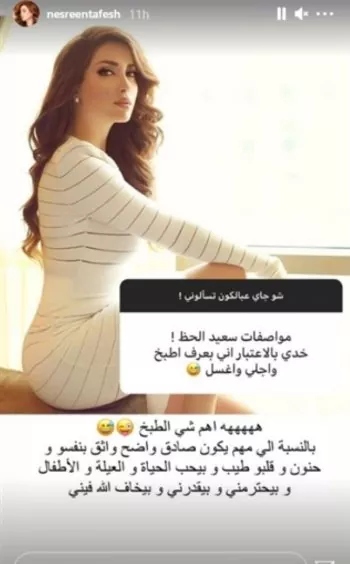 نشرت الفنانة السورية نسرين طافش عبر "ستوري" حسابها الرسمي على انستغرام "شو جاي عالبالكون تسألوني" رغبةً منها في التواصل مع جمهورها.