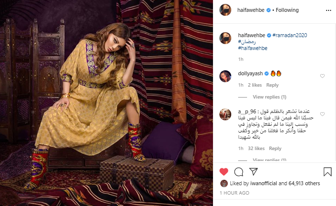 إطلالة هيفاء تبدو للوهلة الأولى قوية وجريئة، إلا أنها تراعي قواعد إطلالات رمضان مع كامل المراعاة للإطلالة المحتشمة الأنيقة والرصينة، لكن خيالها لم يوقفها عند طابع الاحتشام بتصاميم كلاسيكية تفتقر للجرأة، ونسقت معها بوت بنقوش متنوّعة و ألوان زاهية منحها لوكا رمضانيا بامتياز.
