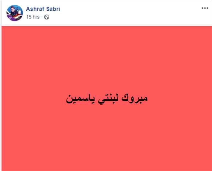 وكتب أشرف صبري عبر حسابه الشخصي على "فيس بوك": "مبروك لبنتي ياسمين"، لينفي بذلك كل ما تردد عن تبرئته منها، بعدما انتشرت رسالة نسبت إليه مكتوبًا بها أنه يتبرأ منها ومن تصرفاتها وأنه لا يرحب بتلك الزيجة.