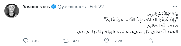 وغردت عبر حسابها الرسمي على موقع التدوينات "تويتر"، وقالت: "بسم الله الرحمن الرحيم "وَإِنْ عَزَمُوا الطَّلَاقَ فَإِنَّ اللَّهَ سَمِيعٌ عَلِيمٌ" صدق الله العظيم.. الحمد لله على كل شىء، عشرة طويلة ولكنها لم تدم."
